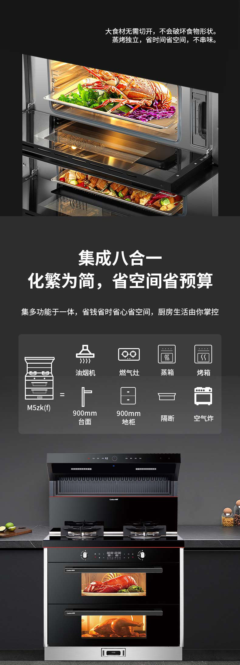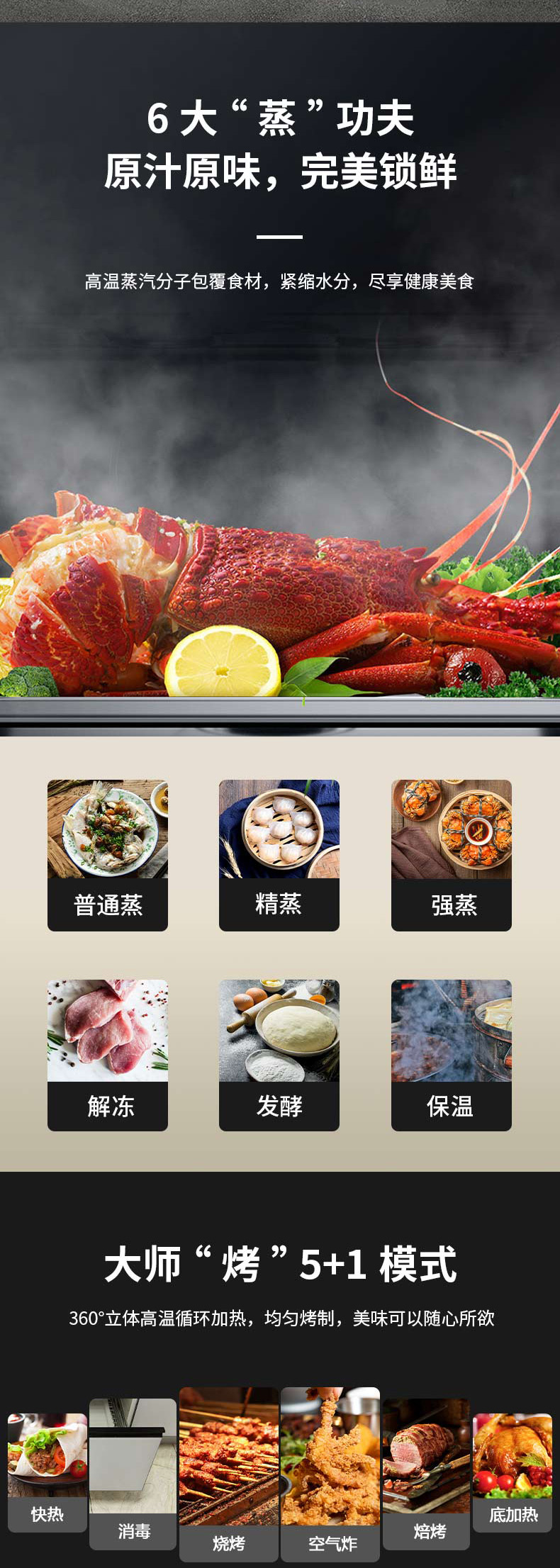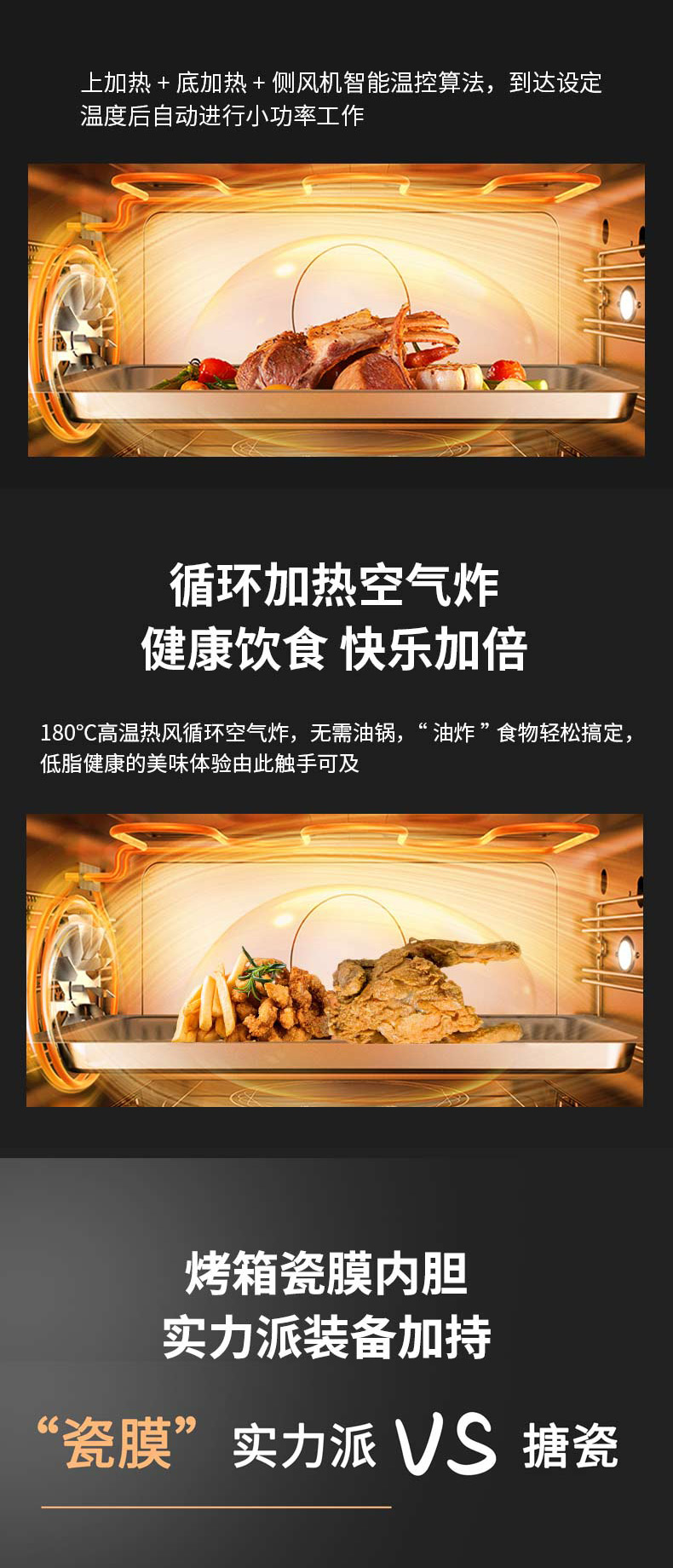 上蒸下烤,蒸烤獨立。智能控制,寬體瓷膜內膽。