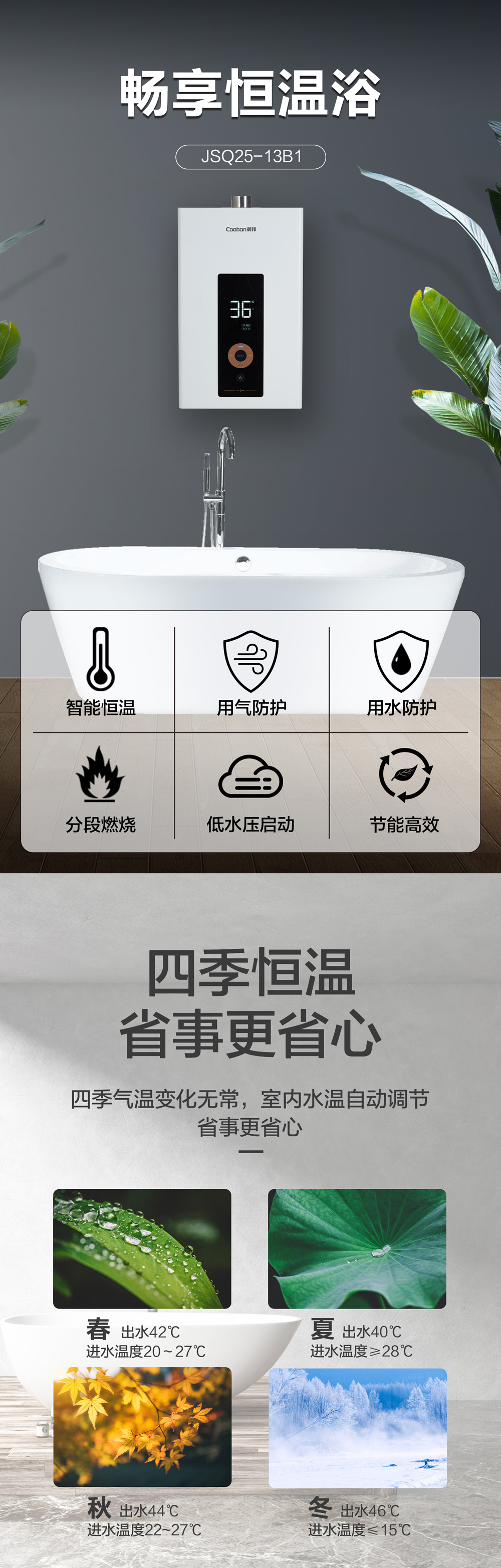 智能恒溫,用氣用水防護(hù),低水壓?jiǎn)?dòng)。